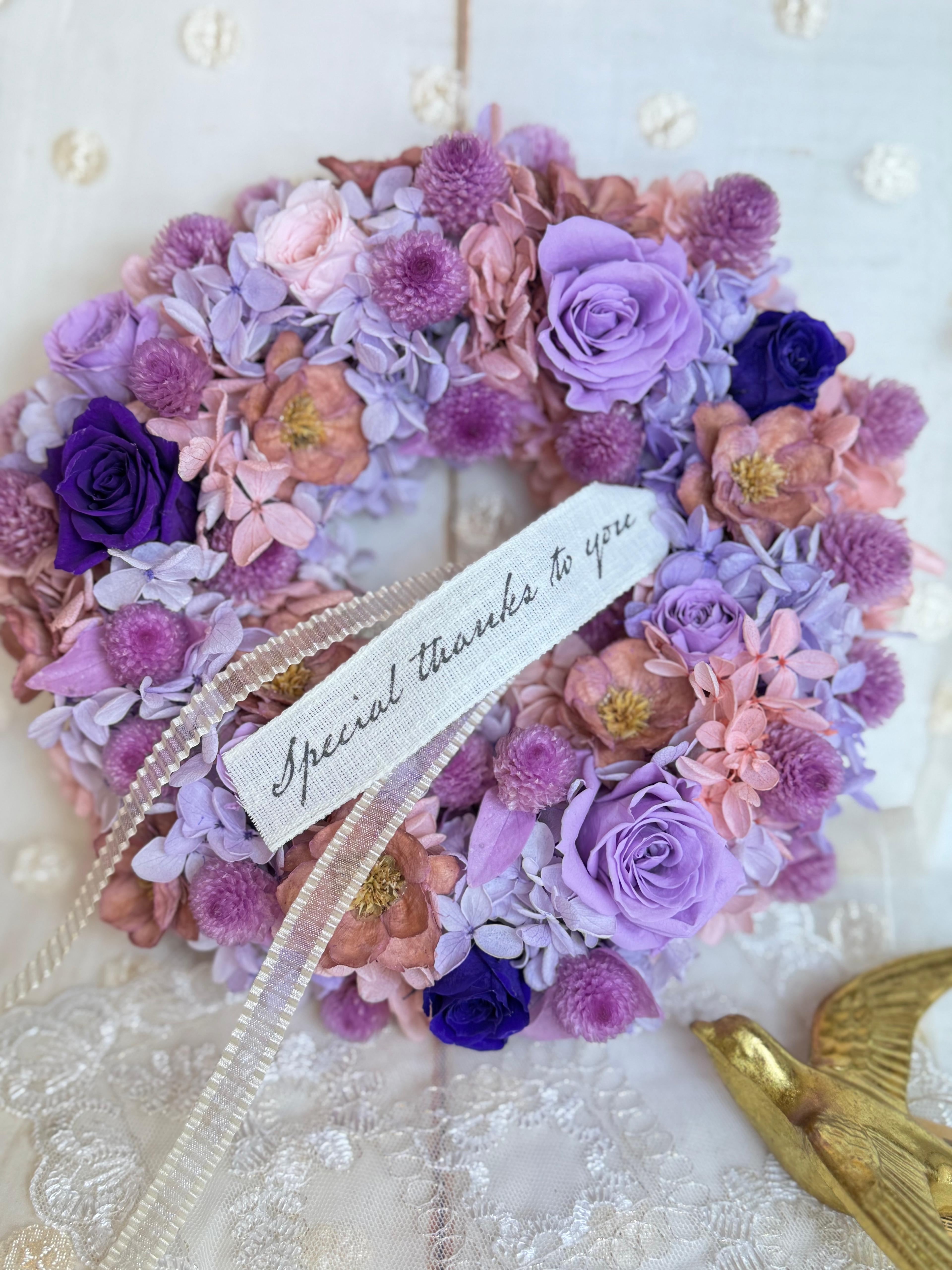 使用されているお花たちは、柔らかな紫色を基調としており、見る者に癒しと安心感を与えます。どんなシーンにも調和するこのリースは、リビングやオフィス、さらにはクリニックの受付スペースなど、様々な場所でその魅力を発揮します。おおらかな色合いが、生活の中に優雅なアクセントを加えることでしょう。