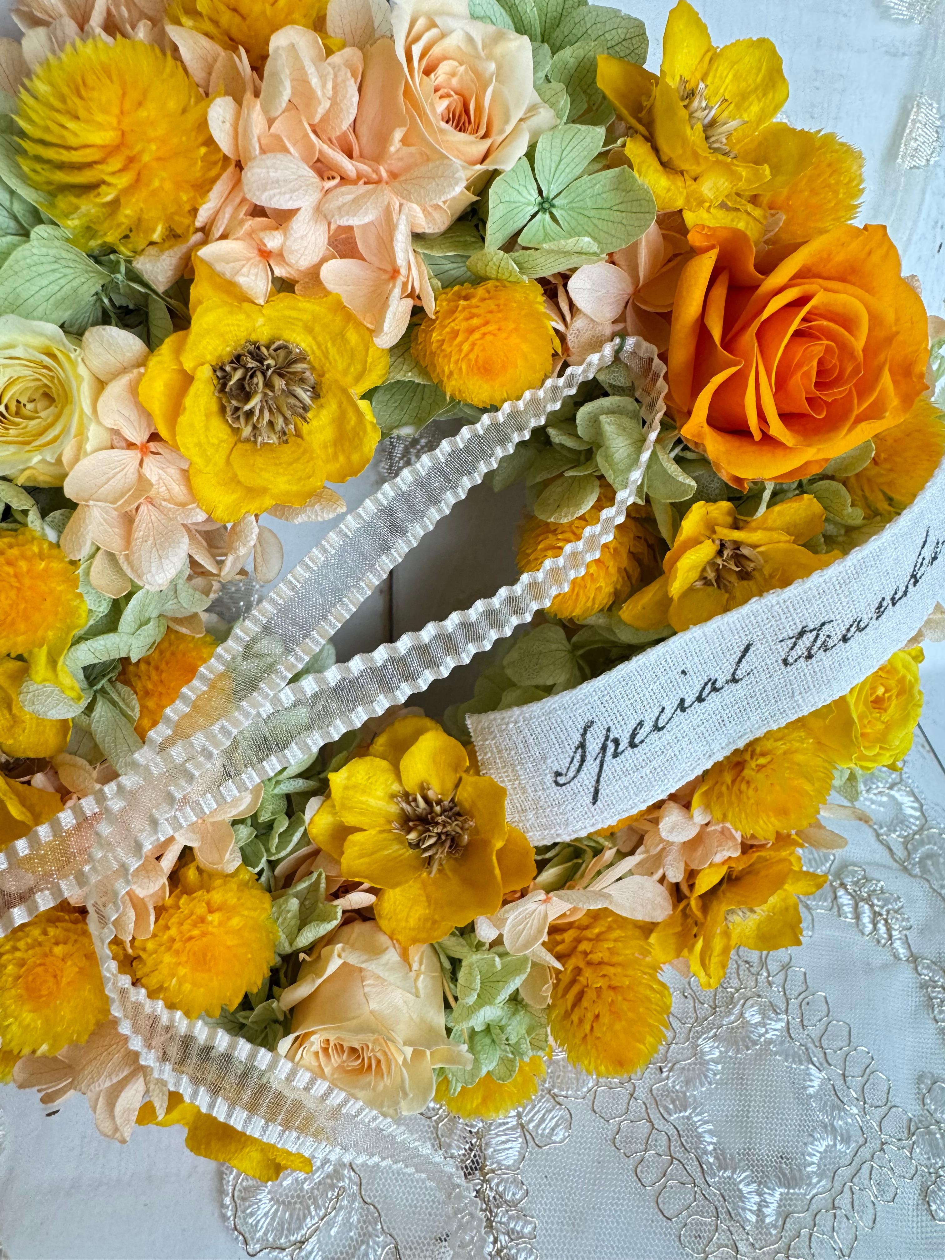 使用するお花は、イエロー・オレンジを基調としたプリザーブドローズ、元気な印象を与えるジニア、そして愛らしい千日紅やアジサイが組み合わさり、まるで自然の美しい風景を表現しています。リビングやオフィス、クリニックなど、様々な場所にぴったりのアイテムで、見る人すべての心を明るく照らします。
